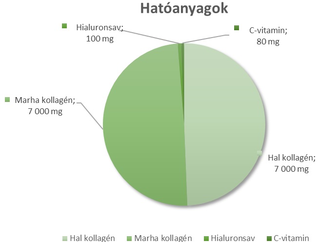 Ingrediente:colagen bovin hidrolizat, colagen marin hidrolizat (HALBOL), regulator de aciditate (acid citric), acid hialuronic, sare, acid ascorbic, colorant (roșu betroot), îndulcitor (sucraloză), aromă